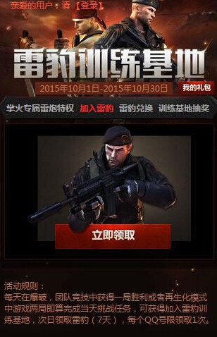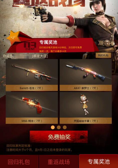 友情提示:此活动仅适于回归玩家(注册时间大于六个月,且9月1日后未登录的玩家),玩家来到页面,可直接领取AK47-黑锋、防弹衣、毛瑟军用手枪,随后只要保持每日登陆,次日均可签到领取不同的游戏道具,登陆越长,领取的道具越好(签到七天),此外,第二天亦可免费抽奖,萌萌的灵狐娃娃,威力巨大的巴雷特苍龙,实用的AK紫罗兰都在等着你哦~