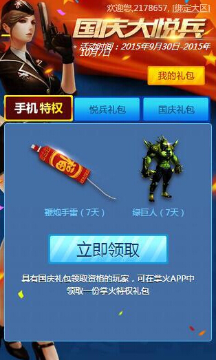 友情提示:玩家只要使用掌上穿越火线进入该活动,立刻便可领取手机端特权礼包,鞭炮手雷、绿巨人。同时也可领取悦兵礼包,最后并且在10月2号15:30准点在线或9.30-10.7期间,在爆破团队竞技或个人模式下累计击杀500次,可领取黄金大礼包,黄金大礼包内容十分丰厚,你还在等什么~记得一定要登录游戏哟~