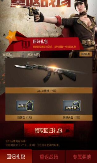 活动简介:针对回归玩家的专属活动,可直接领取AK47-黑锋、防弹衣、毛瑟军用手枪等武器祝你重回战场