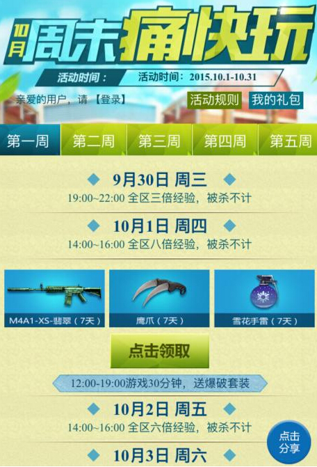 活动简介:每日都有双倍经验,周末在线还可领取超多武器,AWM-翡翠、激光短刃、翡翠M4在等你!