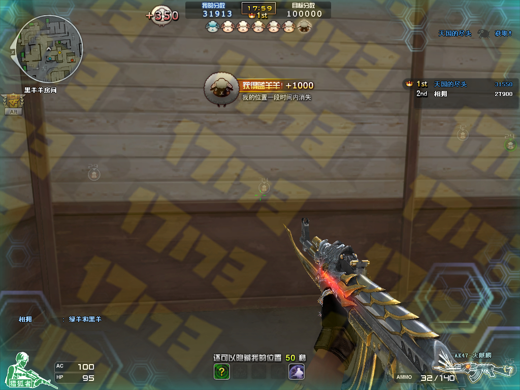 地图中间的有色羊,看见就抢。吃一只是直接可以加上1000分的。尤其绿羊和黑羊我觉得最有用。绿羊在身每打一人可回血20HP。黑羊可以隐藏你的位置,不让别人从界面上发现你。这都是有利于存活的。你带满羊存活时间越长,分长的就越多。被人击杀了羊是会都散掉的。
