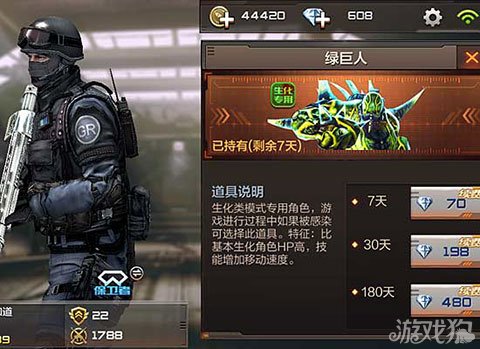 生化模式专用角色,游戏进行过程中如果被感染可选择此道具。特征:比基本生化角色HP高,技能:比基本生化角色HP高,技能增加移动速度。