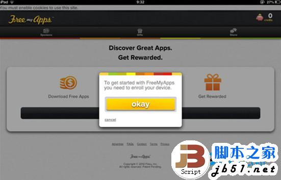 2、点击Get Started,网页会弹出一个小窗口。内容大意:需要使用FreeMyApps,需要验证你的设备