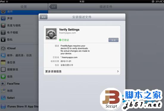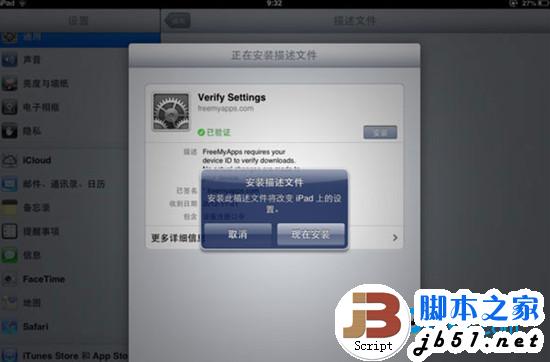 4、设置里要求你安装描述文件。没问题,点安装吧,这个只是读取你设备ID,这个ID仅仅代表了你的设备的编号,不用担心隐私问题。
