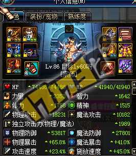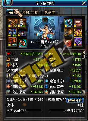 物理攻击力就差3点没满。附魔了深渊之美迪尔卡片。站街属性