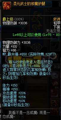 护腿的力量比一般装备稍高,但是会全程混乱(这个不用担心啦,把上下左右键位设置成反的就OK了),但是20%的攻速,25%的释放速度,10%的移动速度加成,这个属性帅气得没话说。