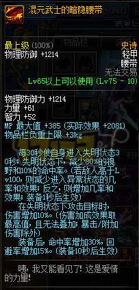 腰带的亮点在于失明状态下有10%的黄字伤害加成(可惜可能会和其他首饰或者武器有冲突),30%的命中率和15%的回避率加成倒不是亮点,因为就算100%的命中依旧会出miss,命中过30%就差不多了。