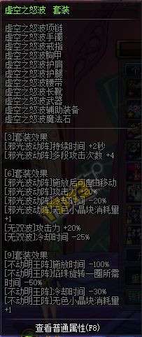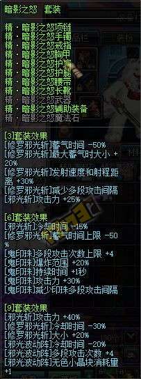 暗影套属于白图王套,极大的强化了邪光斩这个技能。同时因为有天道修罗剑这个武器的存在,使得暗影套一直是炙手可热,超大的邪光斩毁天灭地,全图扫荡,能够推怪聚怪,伤害也是比较不错的。这套现在的地位还是搬砖,镇魂异界没有什么难度,但是不适合刷安图妮,在安徒恩中还是能守舰炮的,效果还不错。但是缺点也比较明显,对于一些无法推动的固定怪,伤害会减少一多半。暗影9+天道修罗剑,或者选择无影天丛云名刀三一等武器。若使用天道修罗剑则只有邪光斩有些伤害,其他技能伤害偏低,ss武器则比较全面。亲测锻7天道和锻8三一在邪光斩这个技能上伤害相同。一般其他位置空出光强右槽或者魂链。
