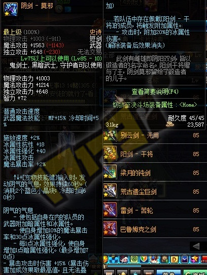 阴阳剑的属性也是非常的出色,高属强,有爆伤,合体之后简直无人能敌,非常不错的武器,前提你最好有个好基友,这把楼主也有