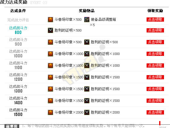 另外决斗场认证后战斗力达到相应值可领取: