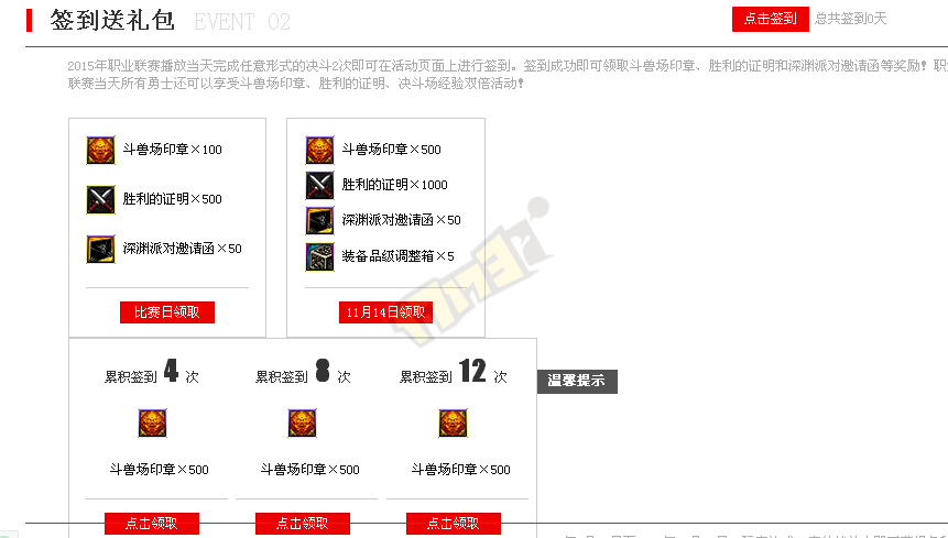 活动日在决斗场中任意决斗两局即可签到、决赛日签到、签到累计可获取:
