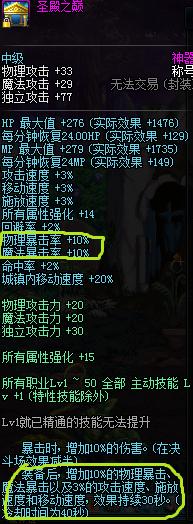 称号出来已久,特殊效果触发大家应该都知道了。我这里再啰嗦的解释一下。自带物理魔法暴击10.触发效果后可以再增加10.也就是说这个称号可以增加20的物理魔法暴击。但是特殊效果,是装备后40秒自动触发,持续30秒,冷却40秒,真空期10秒。