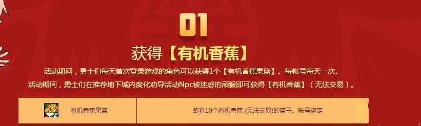 1、活动期间,勇士们每天首次登录游戏的角色可以获得1个【有机香蕉果篮】。每帐号每天一次。