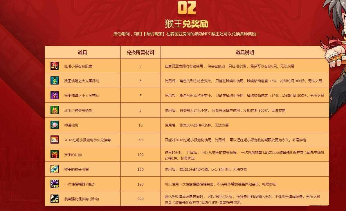 1、活动期间,利用【有机香蕉】在赛丽亚房间的活动NPC猴王处可以兑换各种奖励!