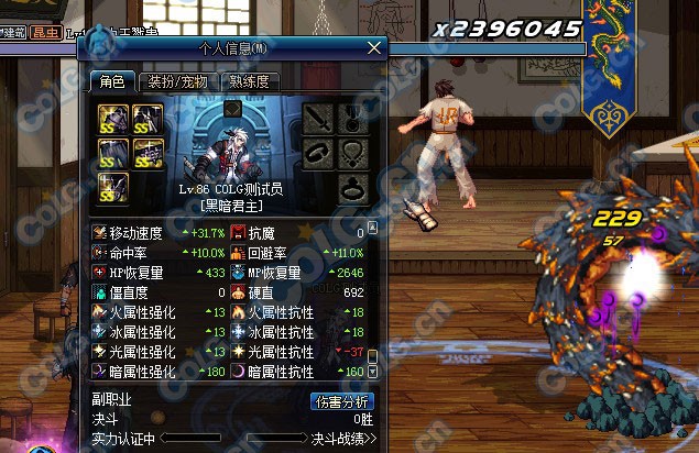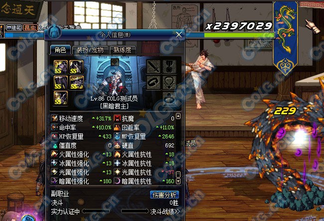 可以看到幽魂附加的白字远远不只10%,己经接近25%,就算算上白字双破,白字伤害也远远不只10%。说明幽魂套的白字是受暗强二次加成的。而这个号现在的暗强只有180,等到400以上的,幽魂套的白字己经几乎达到50%了