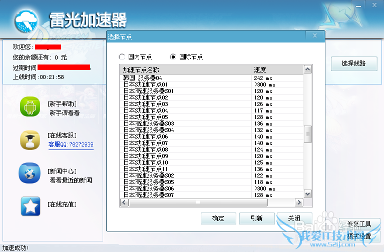 3.点击选择节点,选择国际节点,连接日本路线后 启动加速。