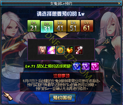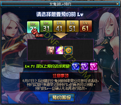 以上就是小编为大家带来的DNF女鬼剑新职业等级预约活动介绍。祝大家游戏愉快!