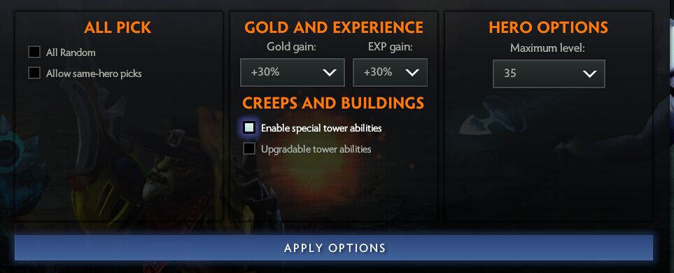 左边的ALL PICK是英雄选择机制,ALL RANDOM是全体随机,Allow same-hero则意味玩家可以选择同样的英雄。
