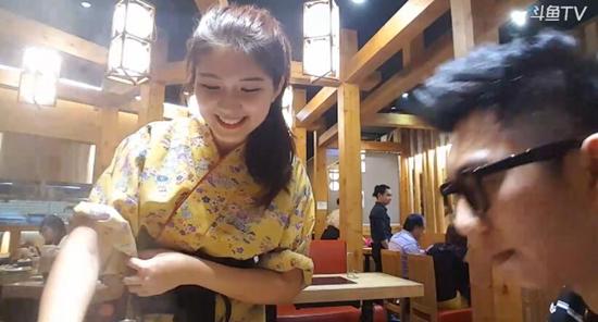 故事就发生在他们吃饭的时候。在等着上菜的过程中,单车直播开始吹逼。突然一个美女服务员出现在镜头面前,看见漂亮妹子弹幕瞬间爆炸,单车顺应民意就和妹纸聊了起来,妹纸非常和善也很配合,对着镜头给水友打招呼。