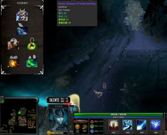 于是,咱艰难地风筝过了雕像。敌法副本,捡了个加静电荷的首饰,于是带上,放2技能,直到魔抗加到顶,然后不放1技能,就能一直有魔抗了。终于加到了62,再加上刚捡 的鞋子,有了71的魔抗: