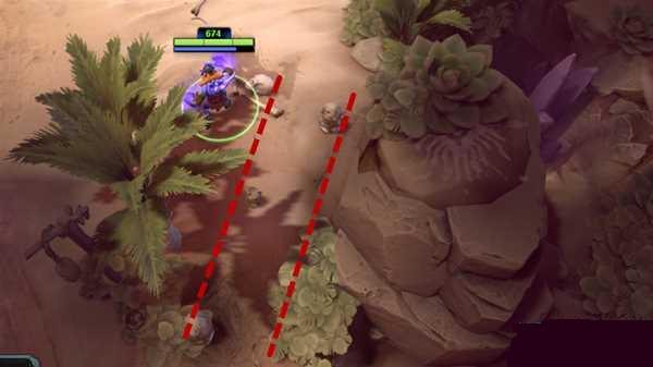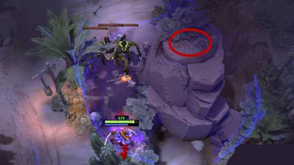 之前看到小技巧,当黑暗贤者的真空技能升到两级(英雄至少要3级),可以将红色虚线框内的树拉掉后(真空可以破树),用真空技能把野怪拉到高台。
