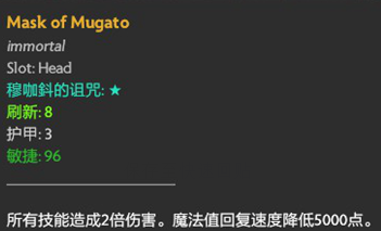 补充下对穆伽托面具的说明:这装备应该说其他英雄也可以用得很顺手。当时我说尴尬是考虑到一些英雄要靠2技能回血,而且也享受不了白色魔法帽和长老护腕的加血效果。但如果运气好出了卫士胫甲,精灵手套之类的,续航也不是问题。这个面具提升的输出非常显著。