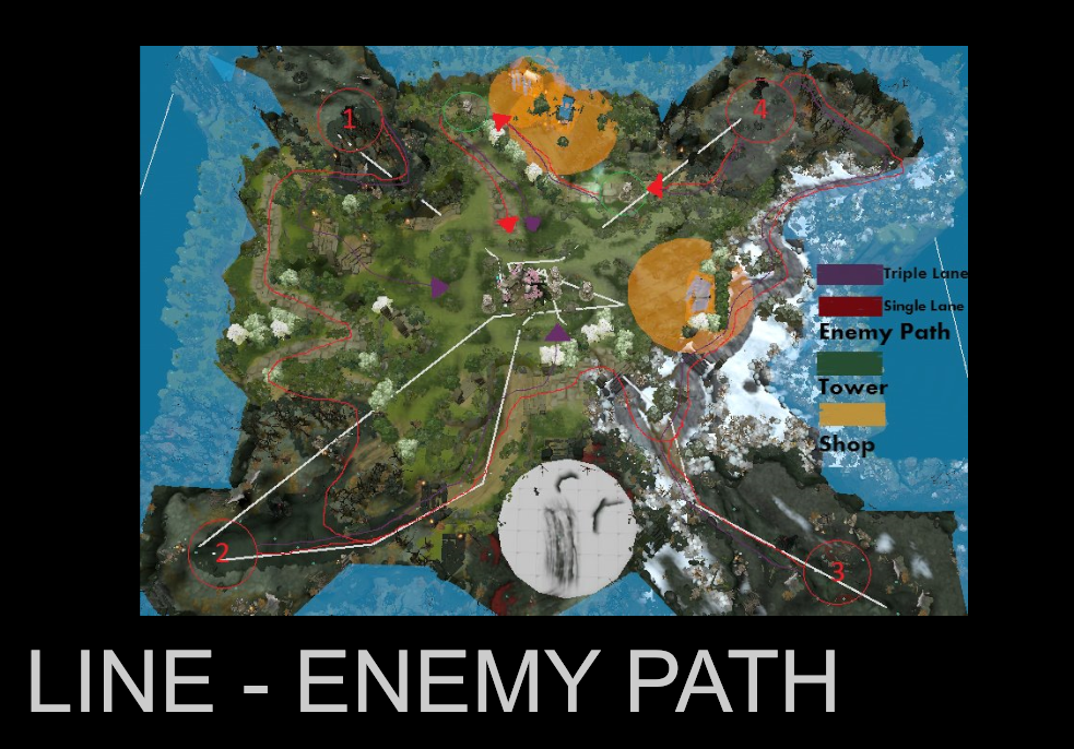 首先,这个地图有两种模式可选。一种是适合1-2个玩家的Single Lane单线模式,这种模式下敌军会从单一线路发起进攻,避免了玩家人数不够防守顾此失彼的情况。如上图红色箭头所示,红色箭头标记了敌军的行进路线,所以在这种模式下,只需在敌军的必经线路上防守就可以了。相反的,另外一种模式就是适合3-6个玩家的Triple Lane三线模式,顾名思义,这个模式下敌军会从三条线路上发起进攻,所以就需要玩家们配合分头守好三条路,敌军的进攻线路如上图紫色箭头所示。另外上图中3个黄色的大圈标记出了商店的位置,右侧有一个普通商店,上方有一个神秘商店和一个普通商店。地图下方的白色大圈是ROSHAN的位置,和DOTA2原版一样,击杀后掉落不朽之守护,在这个图中,不朽之守护另可作为合成高级装备的配件。地图中央为这个图所要保护的遗迹,遗迹要是爆了,游戏就结束了。