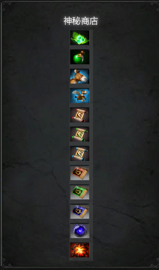 接下来是神秘商店,前四个不必多说,就是注意前期最好带吃树,至于为什么后面我的小贴士会介绍。接下来三个长得像TP的东西是力量,敏捷,智力卷轴,价格不菲,吃了以后相应提升1点属性。在接下来三个则是力量,敏捷,智力之书,吃了以后相应提升10点属性,价格十分不菲。倒数第二个蓝色的是合成大多数大神装的材料,提升3点全属性,价格99999。最后一个显而易见,不朽之守护,和ROSHAN掉的一样,多人模式ROSHAN不够杀而你又需要它来合成装备的话,买吧,价格99999。