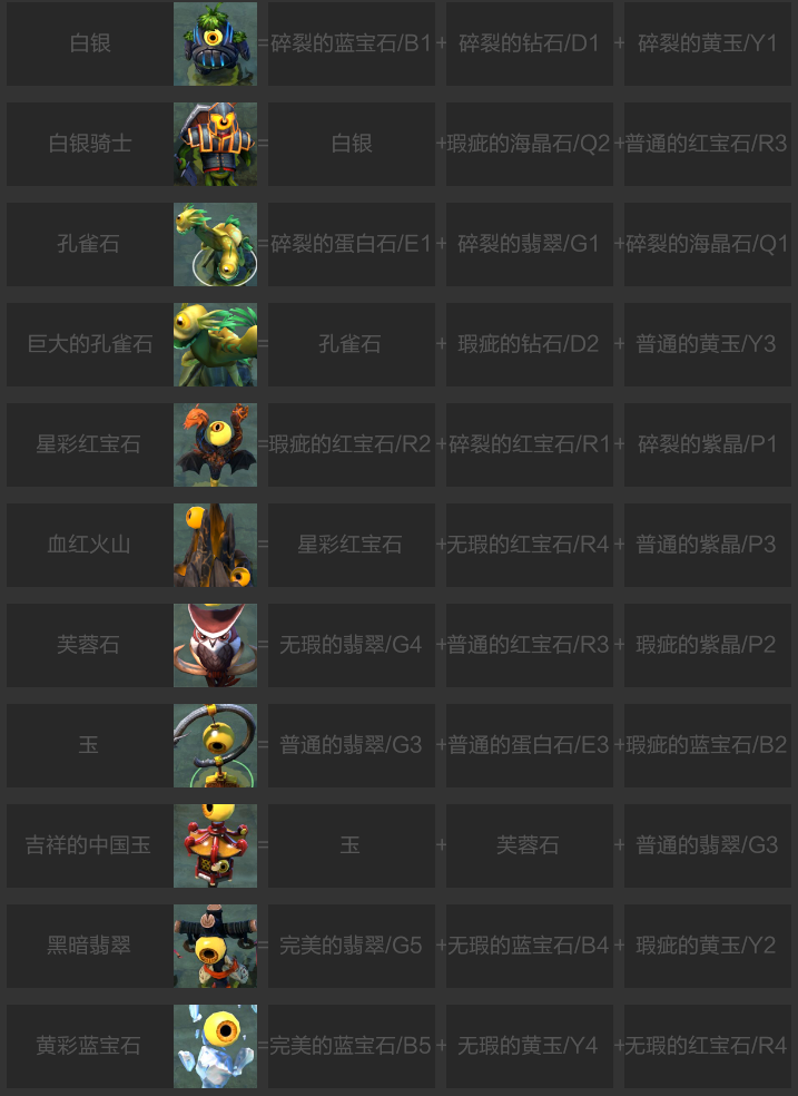 白银骑士,白银的升级版,60基础攻击,攻击减80移动速度。合成需要白银+Q2+R3。Q2在前期很好获得,注意保留,如果是3白银的话,保留一个Q2就行。R3的话前期较难获得,需要2级的时候一波造2个R2合成R3,第10波前能合出白银骑士就很轻松了。R3这种石头需要2个,一个用来合成白银骑士,还有一个用来合芙蓉石。