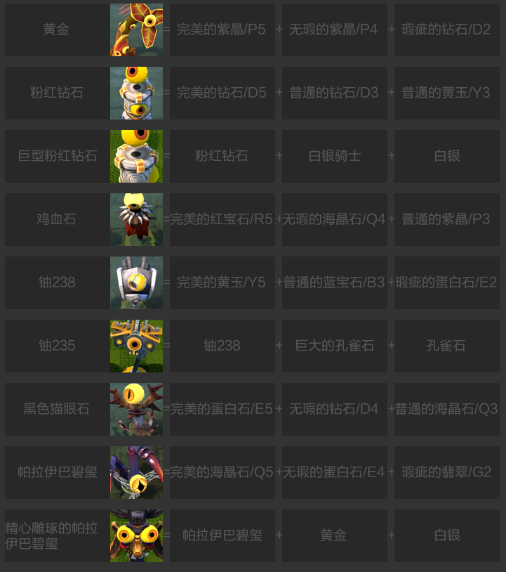巨大的孔雀石,孔雀石的升级版,36基础攻击,可以攻击5个目标。合成需要孔雀石+D2+Y3。D2同Q2,前期较好获得,需保留2个,一个合巨大的孔雀石,另一个中期合黄金需要用到,Y3同R3,前期较难获得。Y3这种石头也需要2个,一个用来合巨大的孔雀石,一个用来合粉红钻石。