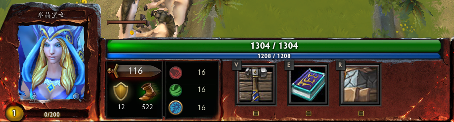 选择英雄的话,目前该图只有冰女,莉娜,主宰和亚巴顿可以选择。英雄并没有特别的技能,只是摆看的。如上图所示,左一技能是打开建造菜单,中间的是学习科技树,是该图特别的地方,右边的是建造上次建造的塔。如上图中所示,英雄虽有攻击力,但是是无法攻击的。在地图最中央可以买把跳刀,10金币,可以跳全图,无CD。