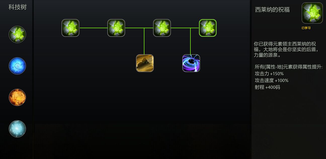 打开学习科技树菜单会出现上图。科技树分为四个派系,从上至下依次是山丘,海洋,燃焰,大气。点亮了一个派系的科技之后才能建造该派系的塔。点亮第一阶可以造一阶塔,点亮第二阶可以造二阶塔,以此类推。每往上点亮一阶塔的科技同时也会增加该派系塔的攻击,攻速以及射程。如上图所示,山丘派系点满可以增加所有大地系塔的攻击力150%,攻速100%以及800射程。在科技树中,除了升级派系阶层,如上图所示,还可以加强塔的技能,比如说沙王塔的沙暴技能,谜团塔的黑洞技能。为什么说最好4人玩呢 ,学习科技树的花费是不菲的,第一阶便宜只要200金币,第二阶1500,第三阶3000,第四阶则要10000金币。所以说每个人专精一种派系是最好的,不然一个人想要精通多个派系的话,金币投资在科技中的太多就会导致塔少,塔的压力太大。