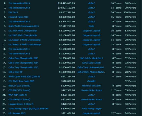 目前全球电竞赛事奖金前25名排行榜(无视21名)