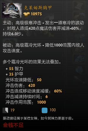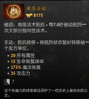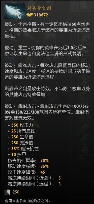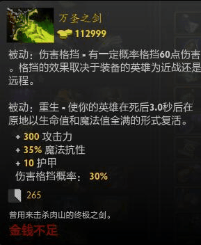 由不朽盾和圣剑外加点券合成,继承了圣剑的300点攻击,但是,额外又加了10点护甲和30%伤害格挡概率(可以理解成先锋盾效果)并且,自带一个不朽盾的效果,冷却时间265秒,可以说物理输出必须人手一把,一来防秒,二来加抗性而且加了不少攻击,并且还能合成更高级的装备