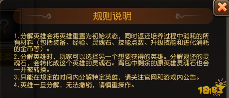答:刀塔传奇英雄分解的规则如以下: 能在规定的时间内分解特定的英雄。 英雄一旦分解,无法撤销,请慎重操作。 分解英雄会将英雄重置为初始状态,同时返还培养过程中消耗的所有材料,包括装备、经验、灵魂石、技能点数、升级技能和进化消耗的金币等... >>详细