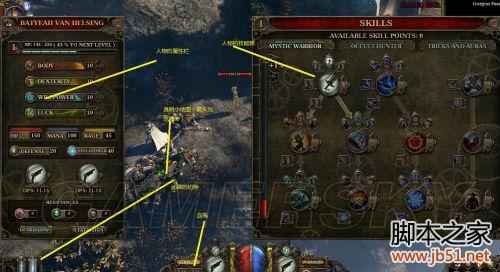 而整个游戏的界面也是完全的经典RPG模块化,如下图标注。玩家需要注意范海辛的主要和次要武器的切换,以及各种快捷键的设定。整个功能界面比较类同于火炬之光