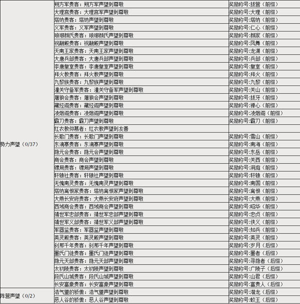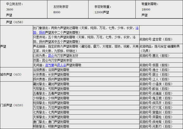 今天小编为大家带来剑网3全声望一览表,包含现阶段所有声望(门派、势力、阵营,城市)