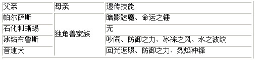 独角兽家族也算是PK中的常客了,其中最卓越的当仁不是白金独角兽了。属性上倒是不错,防冰冻,但是被石系技能双克,所幸石系宠物比较冷门。魔攻110算是比较优越的,但是速度种族值只有82,算是比较低了,双防比较可怜,烈火一招秒不争的事实……守护独角仙踪这么多年给个守护组一点儿也不为过……本身就很完美的白金独角兽是否能更进一步?遗传技能表——