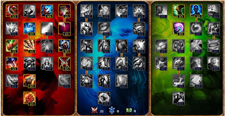 如果对线的英雄对豹女威胁非常小,可以用21-0-9这套天赋,这套天赋使豹女前期回蓝快一些,而且穿梭于草丛时的移速更快。还有减召唤师技能CD,这里不要点出buff持续时间,因为我们是上单,拿不到buff