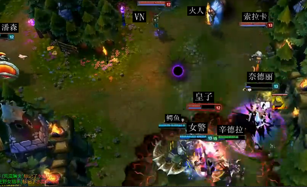 如下图:皇子跳大,留住了三个,这里奈德丽血量不多,但是皇子没有搭理奈德丽,出其不意的开大困住三个满血,明知奈德丽必死就没有浪费技能,反而困住后排输出。第二张图随后就被火人一套AOE秒了。