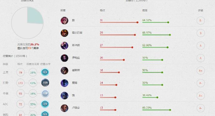 这是我在近500场统计数据,由于经常和朋友开黑所以并不能一直玩打野,而且我排位也不太喜欢特别强势的要位置不过这张图也算是能证明我是个打野比较熟练的选手吧。