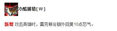 解析:具体来说W技能的改动让雷克顿的怒气来源更加迅速,现在的红怒的雷克顿在使用W攻击英雄的时候就会立刻回复25点怒气,是相当可观的!