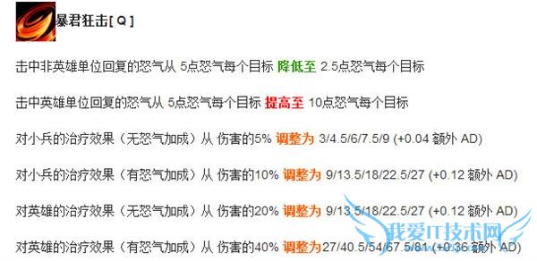 解析:Q技能看似复杂的改动总结来说就是Q技能击中英雄的治疗效果以及怒气获得比改动之前要更多,而击中小兵的治疗效果与怒气获得比之前要低。这样的改动就更加鼓励玩家在对线期间要更多的利用技能去和英雄进行消耗才能更快的叠加怒气,而不是像之前一样用技能Q小兵积攒怒气等到红怒了才上去对拼。