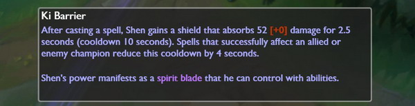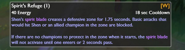 慎的灵剑会制造一个保护性屏障,让慎和附近友军避开所有普攻,持续数秒。当有友方英雄处于区域内时才会触发效果,如果没有友军在区域内,它会一直持续到有人接近或是终止时间为止。