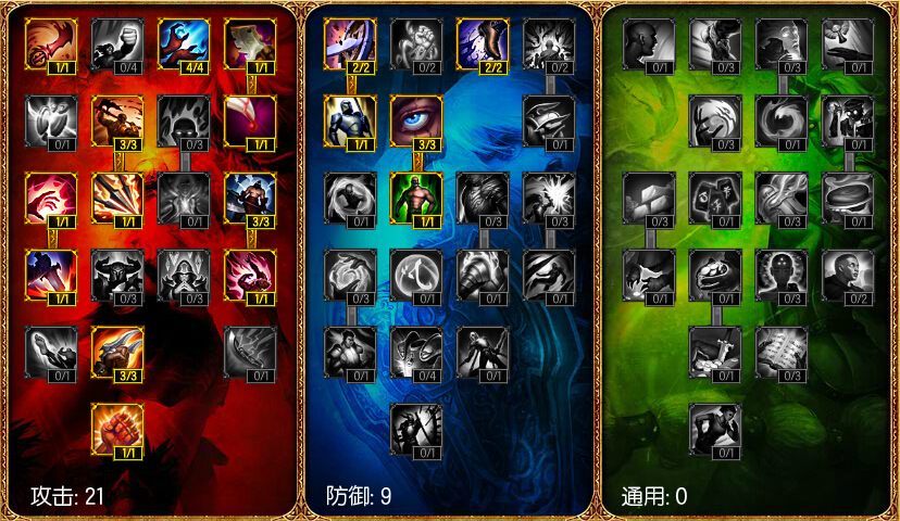 天赋是标准的21/9/0,和一般的AD英雄没有什么太大的区别,唯一需要注意的是![]()