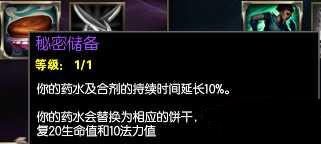 当前版本的辅助往往都会至少在诡诈系天赋中点出12点,那么这三个天赋的选择就在所难免了,对于辅助而言符能亲和和刺客的收益都是极其微弱的,那么我们的选择毫无疑问是秘密储备了。而小编经过实测发现复用性药水不仅无法享用秘密储备中饼干变化的效果就连持续时间延长%10的效果也是不具备的。那么在红药和复用性药水之间也就高下立判了。