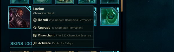 你可以用三个永久皮肤、或是由三个碎片来重掷合成的一个随机内容。重掷后将会是一个未拥有的英雄或皮肤。