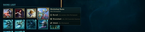 例如说,下面我就会将3个皮肤碎片放在一起重掷,然后利用它们3个就可以解锁出来一个新的努努皮肤了!