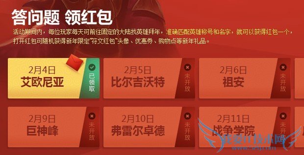 活动期间内,每位玩家每天可前往固定的大陆找英雄拜年,准确匹配英雄称号和名字,就可以获得红包一个, 打开红包可随机获得新年限定”符文红包“头像、优惠券、购物点等新年礼品。