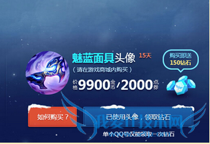 蔚蓝面具不是活动页面上购买的,玩家在活动页面上绑定大区之后,回到游戏客户端进入游戏商城,在时限那边就能找到蔚蓝面具了,一个蔚蓝面具是9900金币或者2000点券,能够获取150钻加一个永久的头像,小编觉得如果是单纯的想要去抽奖的话就不要购买这个头像了,毕竟浪费了50钻石。